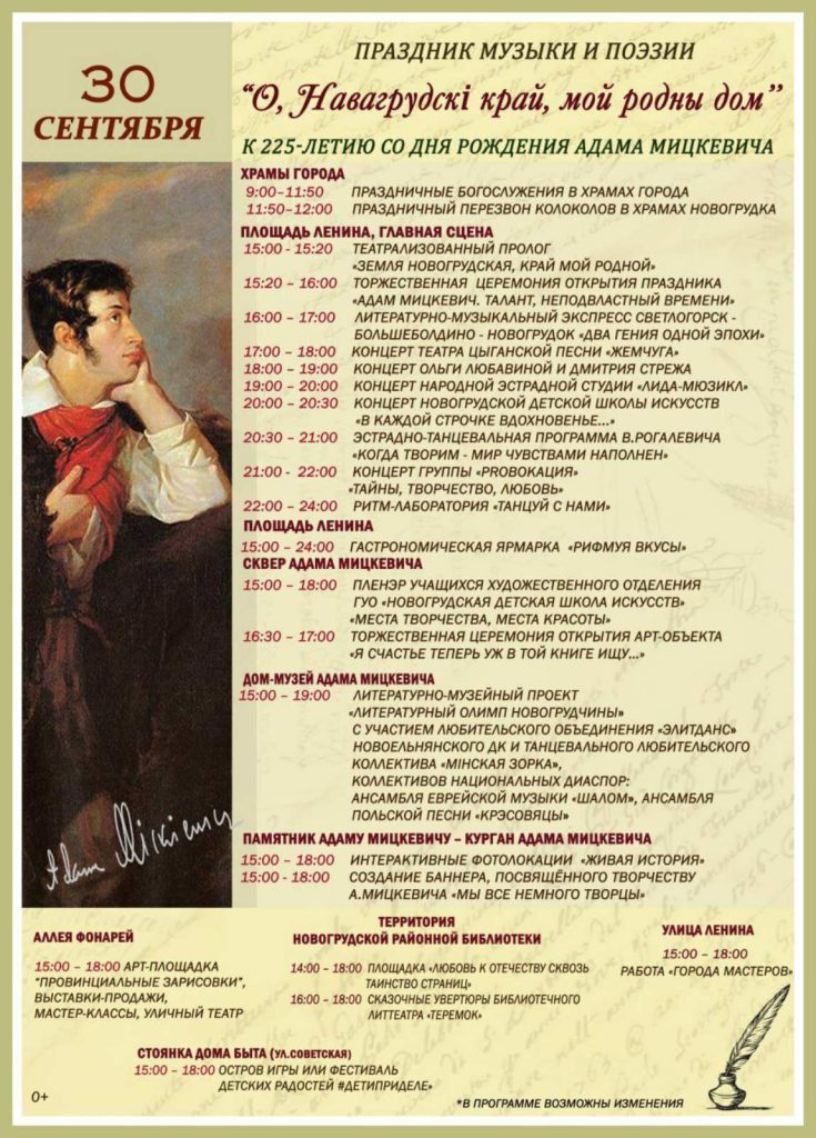 Праздник музыки и поэзии «О, Навагрудскi край, мой родны дом», посвящённый 225-летию со дня рождения Адама Мицкевича, прошёл в Новогрудке. На разных площадках города проходили концерты, работали интересные фотозоны, была организована праздничная торговля и развлечения для горожан и гостей.