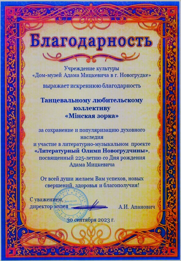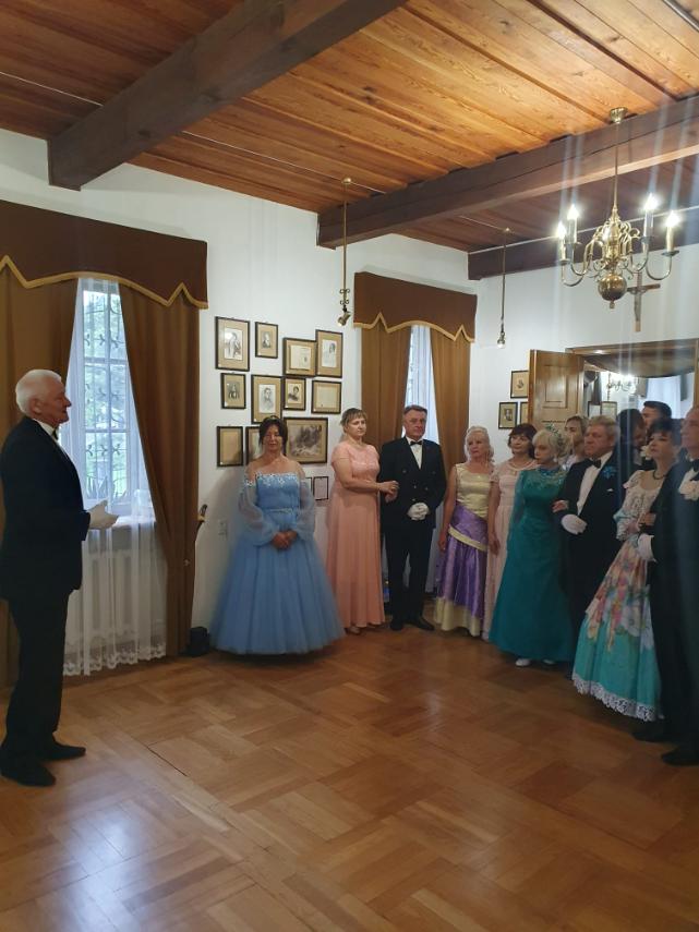 По приглашению Анатолия Кардаша, руководителя танцевального объединения «Элит Данс» Отдела культуры и досуга «Новоельнянского Дома культуры» и сотрудников «Дома-музея Адама Мицкевича в г. Новогрудке», наш коллектив принял участие в танцевальной бальной программе. Мы исполнили показательные танцы «Богемская полька» и «Мiнская зорка».