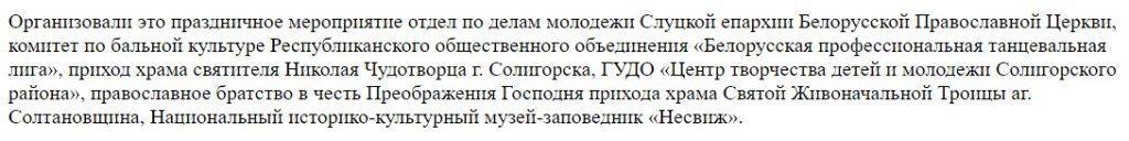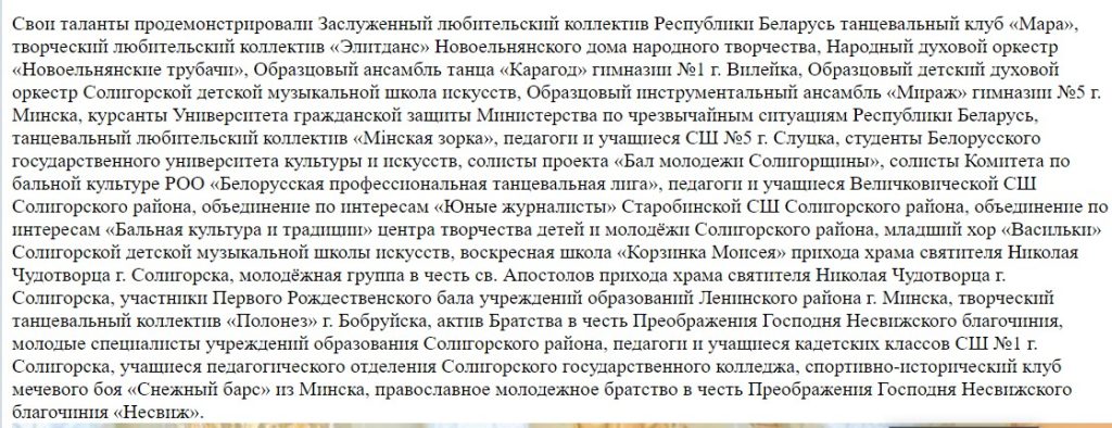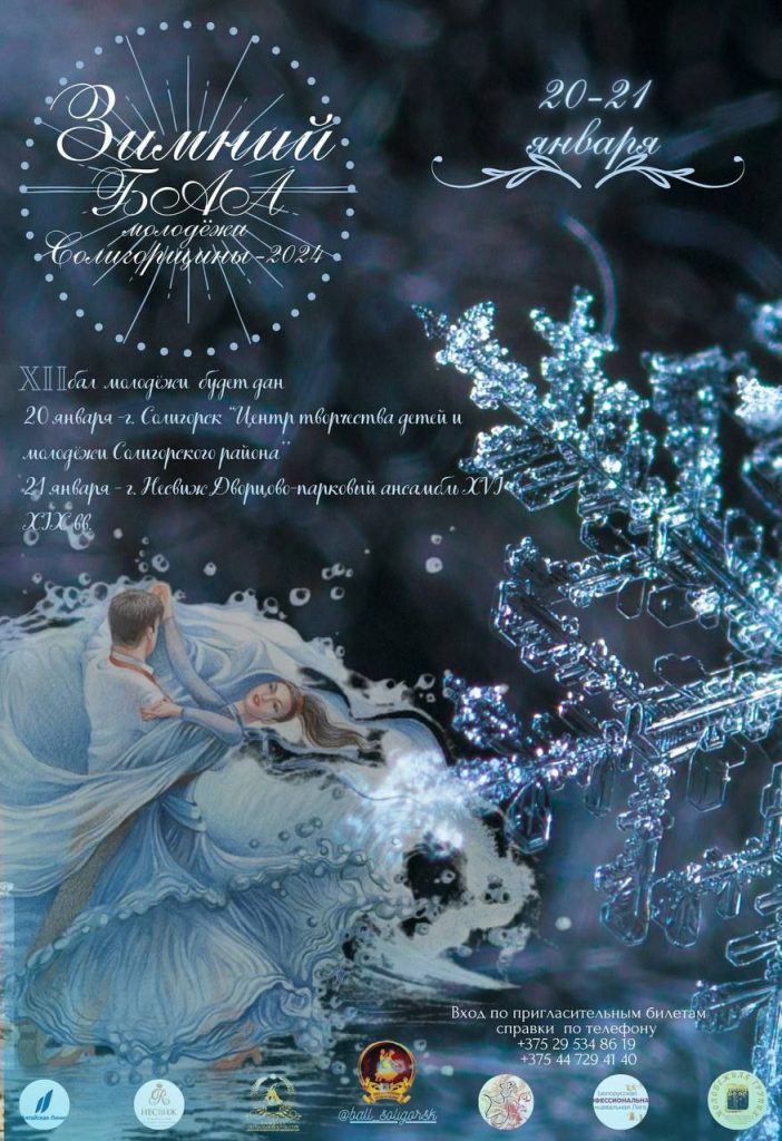 20 и 21 января прошёл ежегодный традиционный «Зимний бал Солигорской молодёжи». В первый день 20.01. 2024г. танцевальные коллективы принял ГУДО «Центр творчества детей и молодёжи Солигорского района». 21.01.2024г. бал продолжился в театральном зале Национального дворцово-паркового музея-заповедника «Несвиж». Наш коллектив достойно представили 10 пар, открыв балы в Солигорске и Несвиже полонезом «Пан Тадеуш». Так же в концертной программе в Несвижском замке, коллектив выступил с нашей визитной карточкой — показательным номером — вальсом «Мiнская зорка».